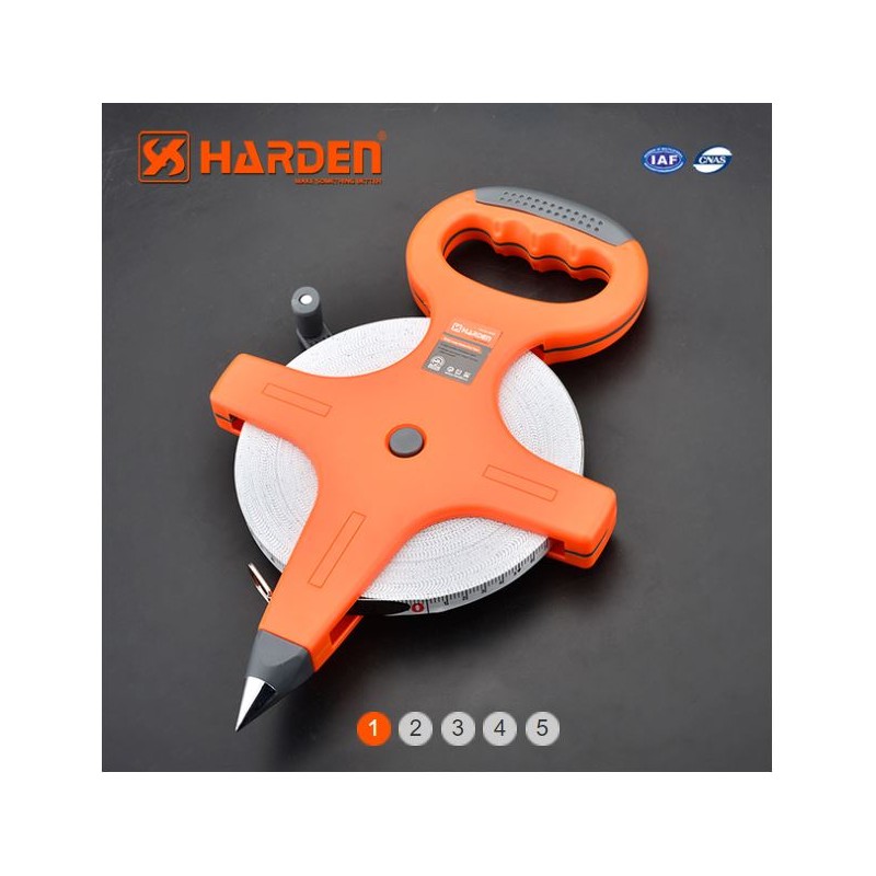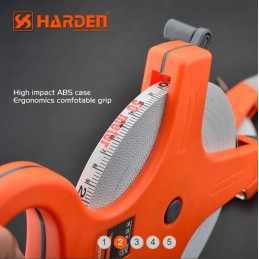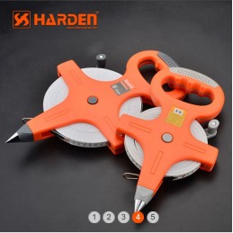 Langes Bandmaß mit 100 m Bandlänge, Stahlgehäuse, mit integriertem Griff zum besseren Halten des Werkzeugs.