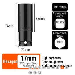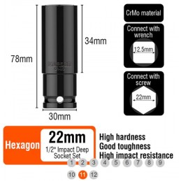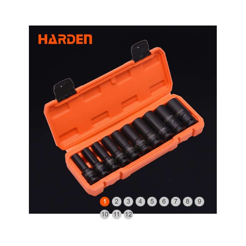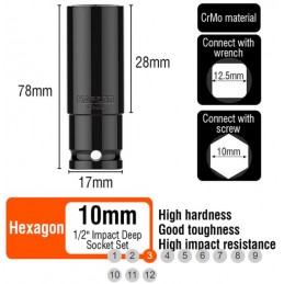 1/2" tiefe Steckschlüssel-Box mit 10 Sechskant-Steckschlüsseln, Größen 10, 12, 13, 14, 15, 17, 19, 21, 22, 24 mm.