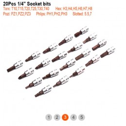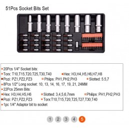 1 Stück 3/8" - 14 mm Zündkerze, 1 Stück 1/2" Zündkerzenstecker 16 mm, 1 Stück 1/2" Zündkerzenstecker 21 mm, 1 Stück Ölwannenschraubenwerkzeug VW, 1 Stück Ölwannenschraubenwerkzeug AUDI, 1 Stück Zylinderkopfschraube VW, 1 Stück Stoßdämpferschraube VW, 1 Stück KFZ-Prüfstift, 1 Stück Filterschlüssel, mit Ablagefach für Werkstattwagen/Schublade.