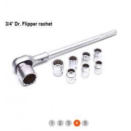Caja de vasos de 3/4" que contiene 27 piezas, incluidos 22 vasos de 12 caras, 2 extensiones, 1 punta de extensión, 1 junta universal, 1 llave de trinquete.