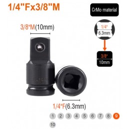 Caja de impacto que contiene 8 adaptadores, 1/4"Fx3/8"M, 3/8"Fx1/4"M, 3/8"Fx1/2"M, 1/2"Fx3/8"M, 1/2" Fx3/4"M, 3/4"Fx1/2"M, 3/4"Fx1"M, 1"Fx3/4"M.