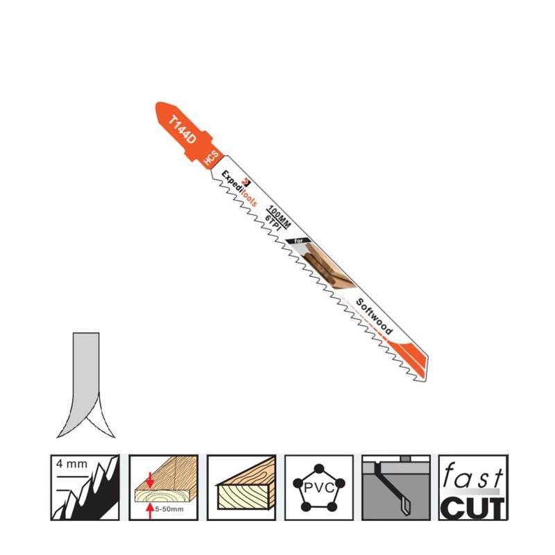 Hoja de sierra de calar T144D para madera blanda, longitud 100 mm, longitud útil 75 mm, TPI 6T, fijación en T