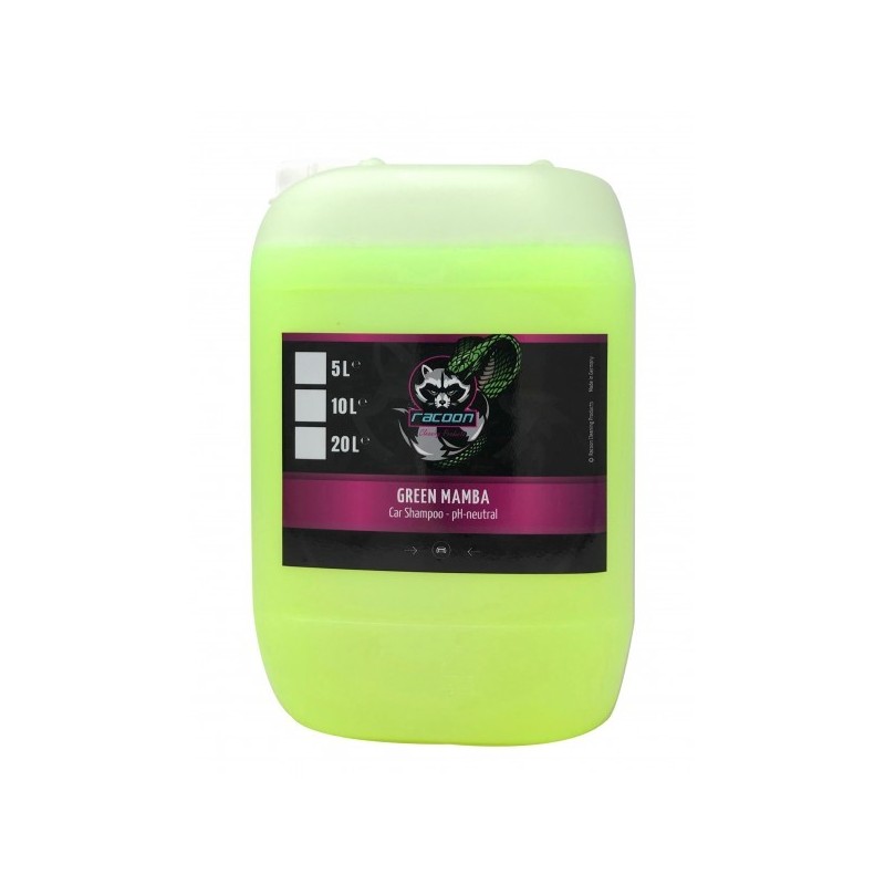 Malgré sa formulation douce et à son pH neutre, le nouveau shampoing Racoon GREEN MAMBA assure un lavage approfondi et fiable du véhicule sans attaquer la peinture ou les couches de cire existantes et les joints/revêtements de peinture. Même si le véhicule est fréquemment lavé avec ce shampoing, la durabilité des joints n'est pas altérée.