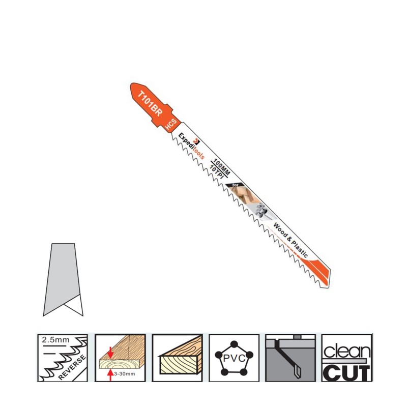 Lama per seghetto alternativo T101BR (dente invertito) per legno e plastica, lunghezza 100 mm, lunghezza utile 75 mm, TPI 10T, fissaggio T
