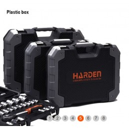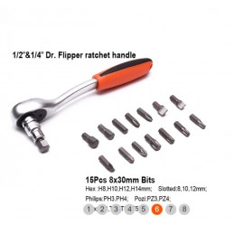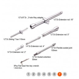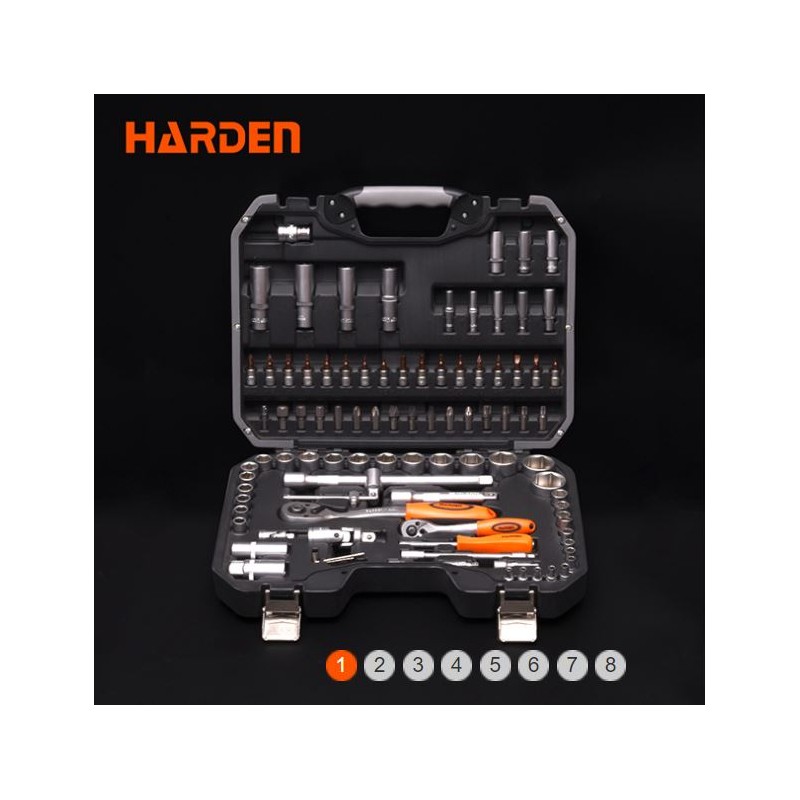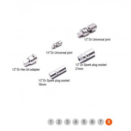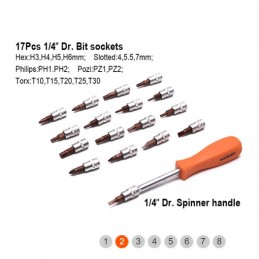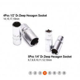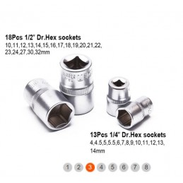Scatola di bussole da 1/2" e 1/4" contenente 94 pezzi così composti: 13 bussole esagonali da 1/4", 8 bussole esagonali profonde da 1/4", 2 prolunghe da 1/4", 1 prolunga flessibile da 1/4", 1 giunto universale da 1/4", 1 impugnatura girevole da 1/4", 1 barra a T scorrevole da 1/4", 1 prolunga per bussola da 1/4", 1 impugnatura a cricchetto Flipper da 1/4", 17 bussole per inserti da 1/4", 18 bussole esagonali da 1/2", 4 bussole esagonali profonde da 1/2", 2 prolunghe da 1/2", 2 bussole per candele da 1/2", 1 adattatore a 3 fori da 1/2", 1 giunto universale da 1/2", 1 adattatore per inserti esagonali da 1/2", 1 impugnatura a cricchetto Flipper da 1/2", 3 chiavi esagonali a testa piatta, 15 inserti.