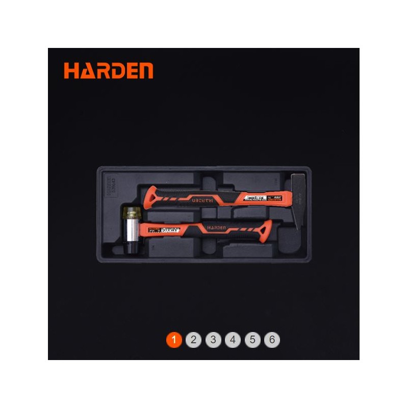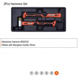 13 bussole esagonali, 4 bussole esagonali lunghe, 1 giunto cardanico, 2 prolunghe, 1 barra scorrevole, 1 adattatore per inserti a molla, 1 impugnatura girevole, 1 chiave a cricchetto con gambo piegato, con contenitore per carrello/cassetto.