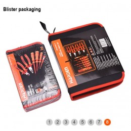 Set van 11 geïsoleerde gereedschappen, 1 mes, 5 schroevendraaiers, 1 spanningszoekerschroevendraaier, 4 tangen. Verpakt in canvas tas. VDE/GS-certificaat, vervaardigd volgens EN60900.