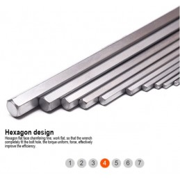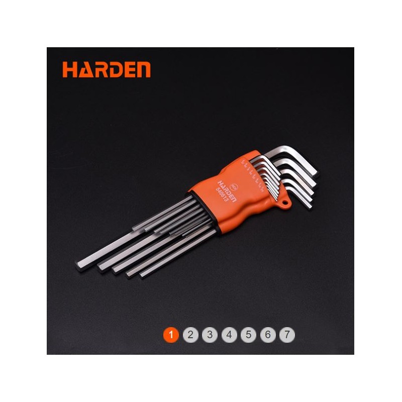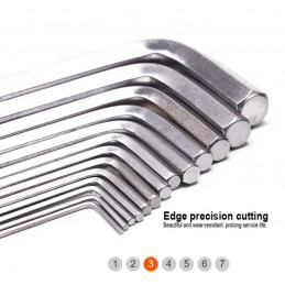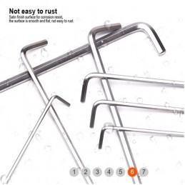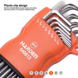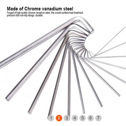 13 lange zeskantsleutels, maten 1/20", 1/16", 5/64", 3/32", 7/64", 1/8", 9/64", 5/32", 3/16", 7/32", 1/4", 5/16", 3/8", met opbergsteun.