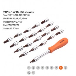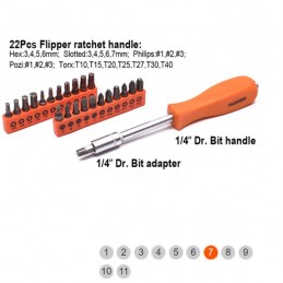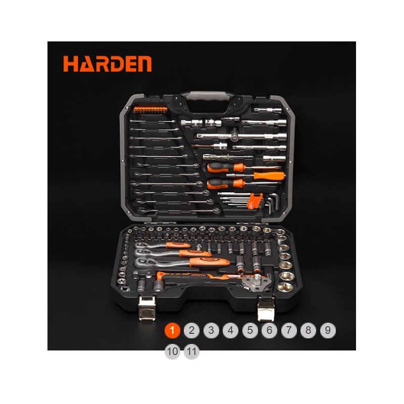 Caixa de soquetes e chaves de boca de 1/2", 3/8", 1/4" contendo 132 peças como 7 soquetes Dr. Hex 1/2", 11 soquetes Dr. Hex 3/8", 4 soquetes Dr. Hex profundos 3/8", 6 soquetes Dr. Torx 3/8", 10 soquetes Dr. Hex 1/4", 4 soquetes Dr. Hex profundos 1/4", 21 soquetes Dr. bit 1/4", 3 juntas universais (1/4", 3/8", 1/2"), 1 adaptador Dr. bit 1/4", 1 cabo Dr. bit 1/4", 2 soquetes de vela de ignição Dr. 1/2" (16, 21 mm), 1 soquete de vela de ignição Dr. 3/8" (14 mm), 11 chaves combinadas (8-19 mm), 1 haste de extensão Dr. 1/4", 2 hastes de extensão Dr. 3/8", 2 Dr. hastes de extensão 1/2", 3 cabos de catraca flipper (1/4", 3/8", 1/2"), 2 adaptadores de torneira de mangueira, 1 testador automático 12-24V, 2 chaves de fenda de percussão 6x100 mm (fenda e philips), 9 chaves de fenda de esfera (1,5-10 mm), 1 soquete de broca Dr. 1/2" T52, 1 chave de filtro de óleo de três garras, 1 soquete para desmontagem do amortecedor, 1 soquete sextavado H17 para parafuso de desmontagem, 1 soquete bi-hexagonal M16 para parafuso de desmontagem, 1 martelo mecânico de 300 gr com cabo de fibra de vidro, 22 bits.
