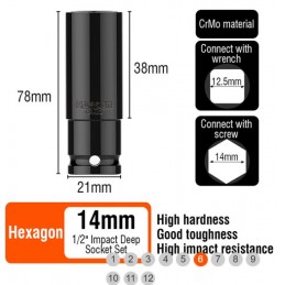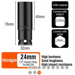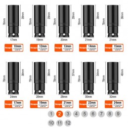 Caixa de soquetes de 1/2" de profundidade contendo 10 soquetes hexagonais, tamanhos 10, 12, 13, 14, 15, 17, 19, 21, 22, 24 mm.