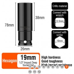 Caixa de soquetes de 1/2" contendo 8 soquetes sextavados, tamanhos H6, H7, H8, H10, H12, H14, H17, H19.