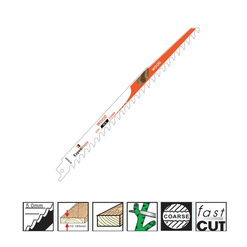 Lâmina de serra alternativa S1542K para madeira verde, comprimento 240 mm, comprimento útil 220 mm, TPI 3T, largura 19 mm, espessura 1,5 mm